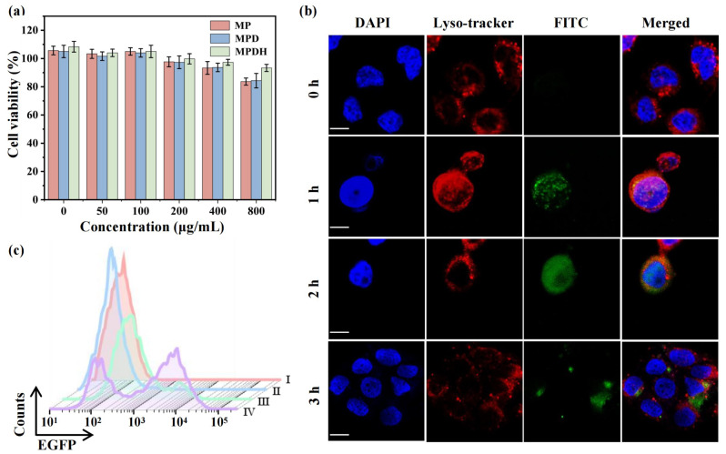 在体外治疗研究中,研究人员首先使用Cell Counting Kit-8 (CCK-8) 评估了MP/MPD/MPDH纳米颗粒的细胞毒性。结果显示,这些纳米颗粒在不同浓度下对4T1细胞几乎没有显著毒性,表明其良好的生物相容性。特别是MPFD处理的4T1细胞在200–800 μg/mL浓度范围内显示出更高的细胞活性,可能由于透明质酸(HA)中和了聚乙烯亚胺(PEI)表面的过量正电荷。MPFD纳米颗粒对正常C166小鼠内皮细胞也表现出较低的细胞毒性。 进一步研究发现,MPDH纳米颗粒在4T1细胞中的内化效率高于C166细胞,表明HA修饰增强了MPDH的靶向性。共聚焦成像显示,纳米颗粒逐渐与溶酶体共定位,并且PEI的质子海绵效应有助于内体逃逸,从而促进质粒释放进入细胞核。