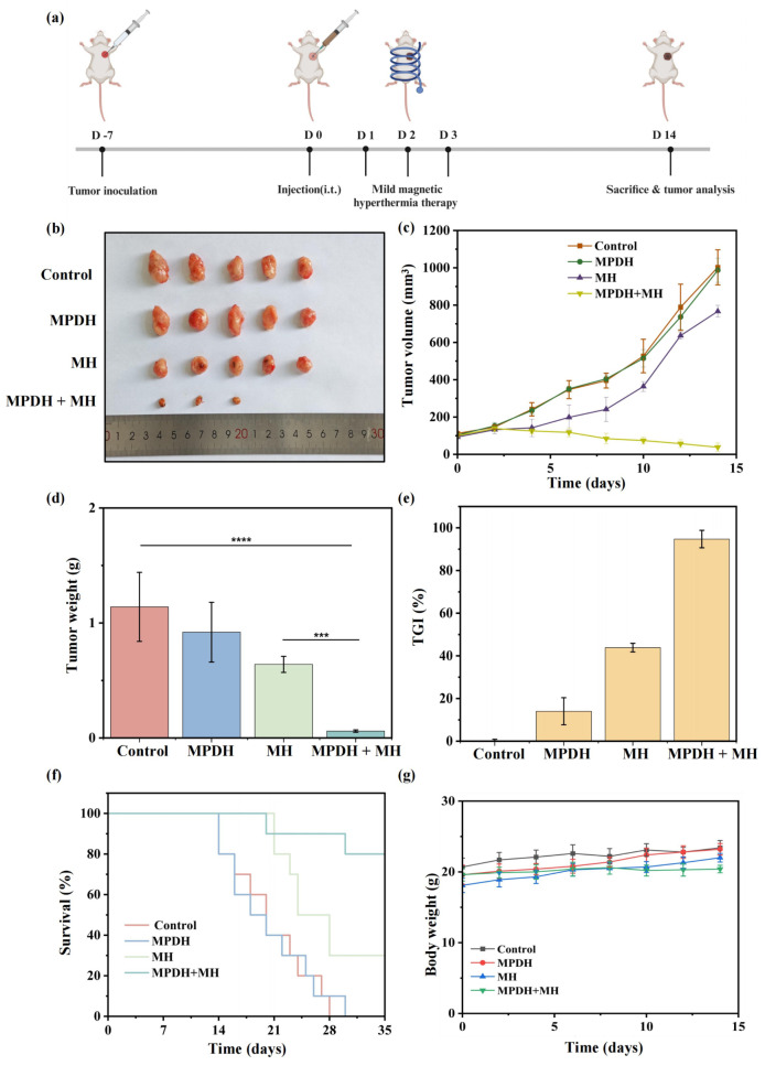 为了评估磁热增强CRISPR/Cas9基因编辑系统的体内肿瘤凋亡诱导和生长抑制能力,研究人员利用4T1荷瘤小鼠模型评估。小鼠随机分为对照组、MPDH治疗组、磁热治疗(MH)组和MPDH联合轻度磁热疗(MPDH+MH)组。经过MPDH纳米颗粒注射后,MH和MPDH+MH组的小鼠接受了为期三天的轻度磁热治疗。结果显示,MPDH+MH组显著抑制了肿瘤生长,肿瘤细胞死亡率高,肿瘤大小显著减少,且在治疗第35天生存率达到80%,而MH组仅为30%。所有治疗组的体重变化无显著差异,表明对小鼠整体健康影响较小。