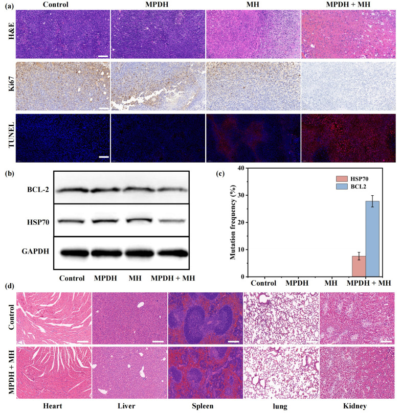 为了评估MPDH的体内基因编辑效果,研究人员使用Western blot分析和深度测序法对肿瘤组织中的HSP70和BCL2表达进行了评估。结果显示,MPDH + MH治疗组的HSP70和BCL2蛋白表达水平显著降低,mRNA分析进一步确认了基因的有效敲低。此外,通过DNA测序,MPDH + MH组的HSP70和BCL2基因突变频率分别为7.6%和27.8%。治疗后,进行了小鼠的全血细胞计数、血清生化分析以及器官的组织病理学检查,未发现明显的器官损伤或炎症,血液和肝肾功能指标均正常。这些结果表明,MPDH结合磁热的基因编辑治疗系统在治疗过程中具有良好的生物安全性。