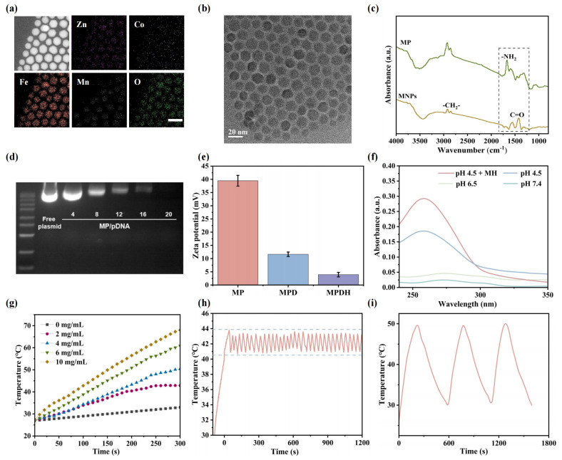 为了构建MPDH纳米基因编辑系统,研究人员首先通过种子介导法合成了磁热纳米粒子MNPs(ZnCoFe2O4 @ ZnMnFe2O4),这些纳米颗粒尺寸约为15.3nm,表现出优异的单分散性。研究人员使用C18-PEI对纳米颗粒表面进行修饰,提高了细胞摄取效率和质粒DNA的有效负载,获得了可稳定分散在水和PBS中的MP纳米颗粒。傅里叶变换红外光谱 (FT-IR)和热重分析 (TGA)验证了表面改性的成功,为后续生物医学应用奠定了基础。MPDH纳米基因编辑系统通过静电吸附质粒,有效结合Cas9,并展示出稳定的尺寸与分散性。