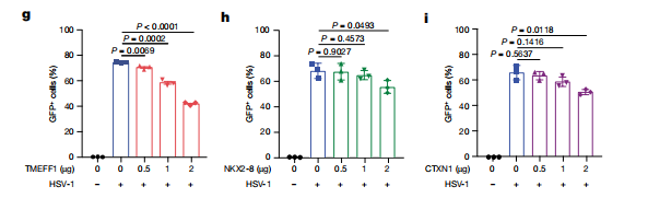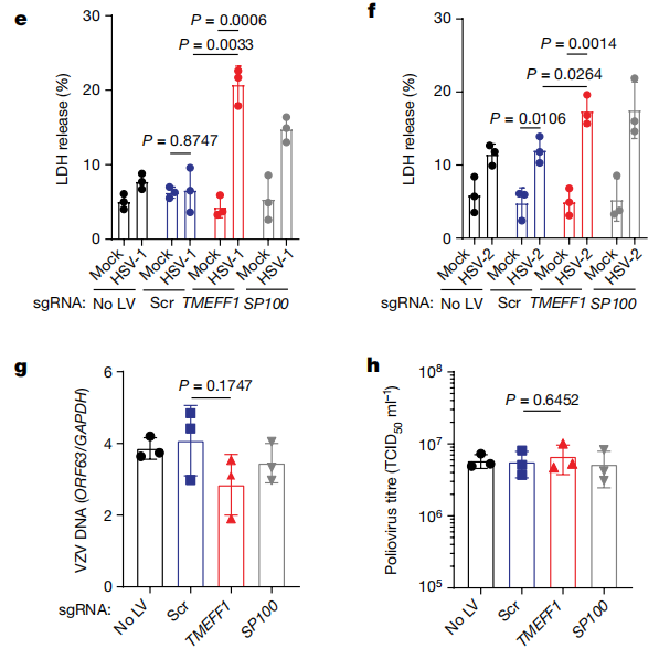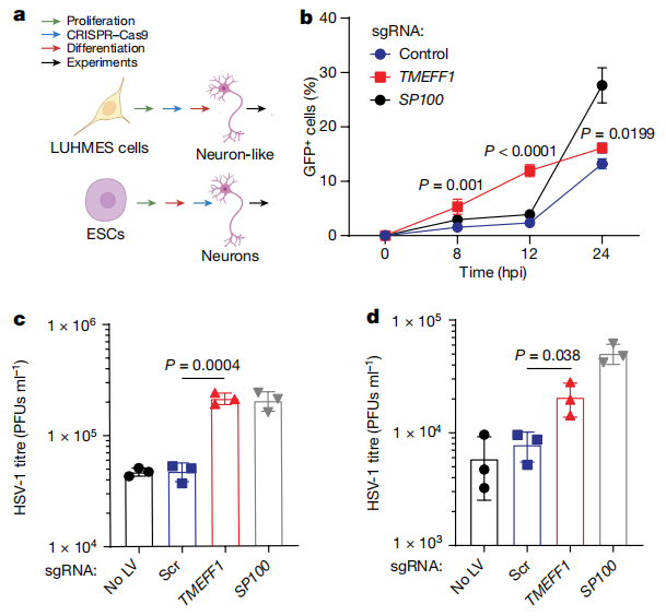 利用CRISPR-Cas9技术在LUHMES胚胎神经前体细胞衍生的神经元和人胚胎干细胞(hESC)衍生的皮层神经元中敲除TMEFF1,并用HSV-1-GFP攻毒。结果显示,TMEFF1缺失的神经元中HSV-1的复制效率显著提高,病毒基因组的表达水平在早期就显著增加,同时伴随着更高的神经元死亡率,且仅对HSV病毒更加敏感,而对寨卡病毒,脊髓灰质炎病毒感染影响不大。