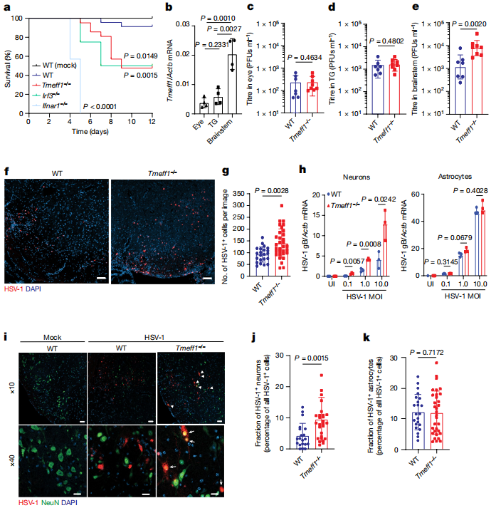 研究人员使用Tmeff1基因敲除(Tmeff1−/−)小鼠进行HSV-1感染实验,观察小鼠的生存率、体重变化和疾病症状。Tmeff1−/−小鼠在HSV-1感染后生存率显著降低,体重下降更快,疾病症状更严重。特别是在大脑干中,HSV-1的载量显著增加,且这种增加主要发生在神经元中。