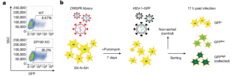 为了获得理想的筛选模型,研究人员首先进行预实验,结果发现神经母细胞瘤细胞系SK-N-SH通过核酸感应途径反应有限且对HSV-1感染不产生IFN反应,因此选择其成成为筛选模型。接着构建SK-N-SH Cas9稳转细胞株,并使用GeCKO v2 CRISPR文库感染该细胞系,通过puromycin筛选7天获得敲除细胞pool和HSV-1-GFP病毒株感染敲除细胞pool。利用荧光分选出不同亮度的细胞,并使用MAGeCK对比荧光亮度较强细胞与未分选细胞的sgRNA富集程度。