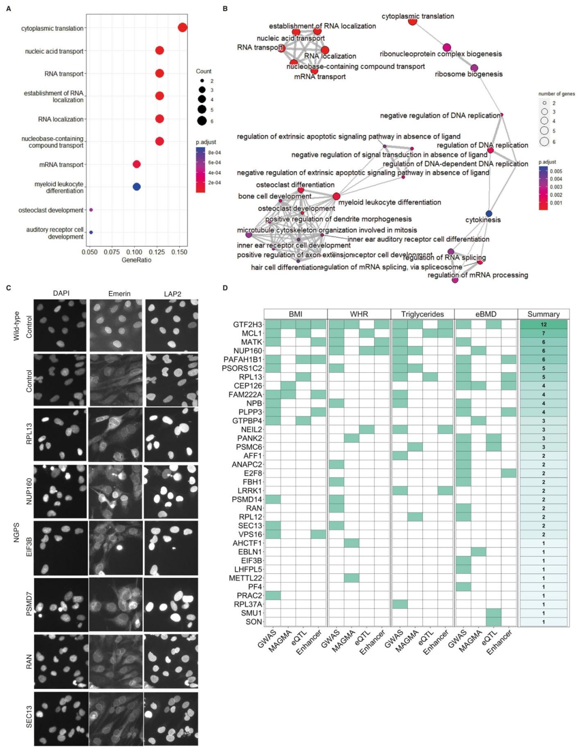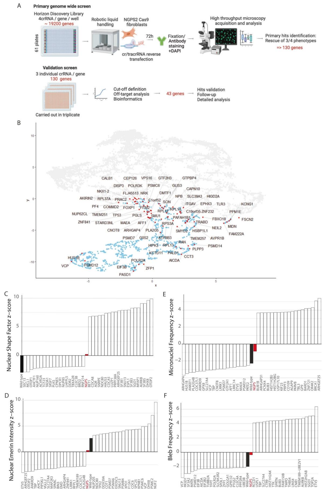 研究者利用CRISPR/Cas9技术对约20,000个人类基因进行逐个敲除实验,观察这些基因缺失对上述四种表型的影响。通过高通量显微镜成像技术,他们筛选出130个候选基因,并在后续验证中确认了43个基因能够显著改善NGPS细胞的异常表型。