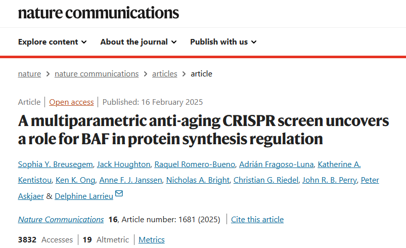 在2025年2月16日,剑桥大学的剑桥医学研究所Delphine Larrieu教授所带领的研究团队在《Nature Communications》期刊发表了一项突破性的研究。该研究成果题为“A multiparametric anti-aging CRISPR screen uncovers a role for BAF in protein synthesis regulation”,通过全基因组 、多参数CRISPR筛选,揭示了 BAF 在蛋白质合成调控中的作用,为研究早衰症的发病机制和潜在治疗靶点提供了重要依据。