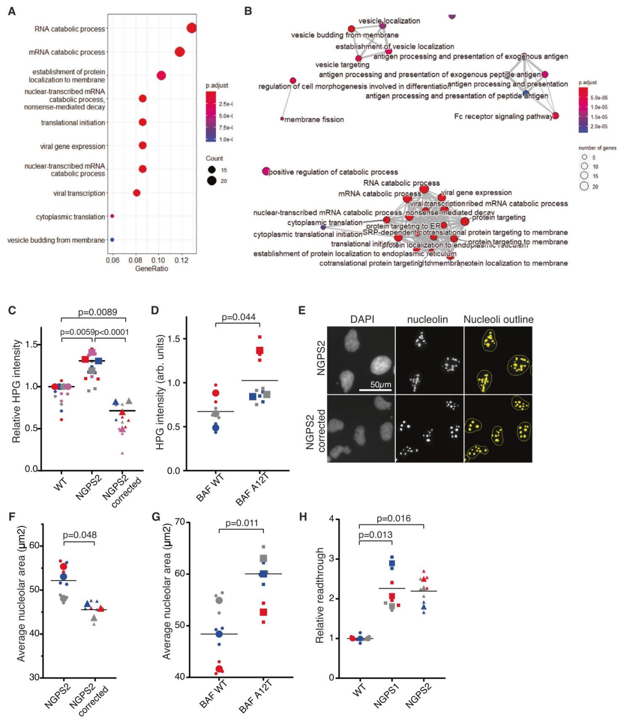 通过基因本体论(GO)富集分析,研究者发现这些基因主要富集在蛋白质合成、蛋白质和RNA运输以及破骨细胞发育等生物学过程中。进一步的实验验证表明,BAF A12T突变导致NGPS细胞的蛋白合成速率显著增加,并伴随着更高的翻译错误率。这种蛋白合成失调可能是早衰症加速衰老的关键机制之一。