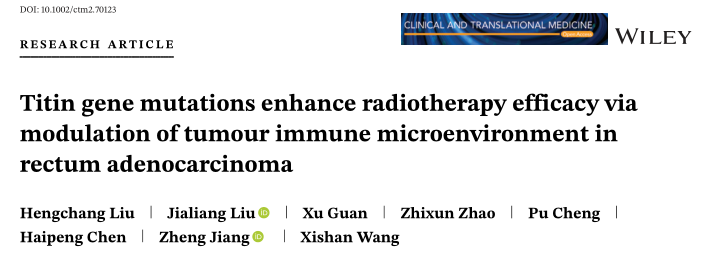 近期,北京协和医学院肿瘤医院Liu Hengchang 等人在国际知名期刊《Clinical and translational medicine》发表文章“Titin gene mutations enhance radiotherapy efficacy via modulation of tumour immune microenvironment in rectum adenocarcinoma”,揭示了TTN基因突变如何通过影响DNA损伤修复和免疫细胞浸润来提高放疗敏感性,并提出了TTN突变作为预测放疗反应的生物标志物的可能性。