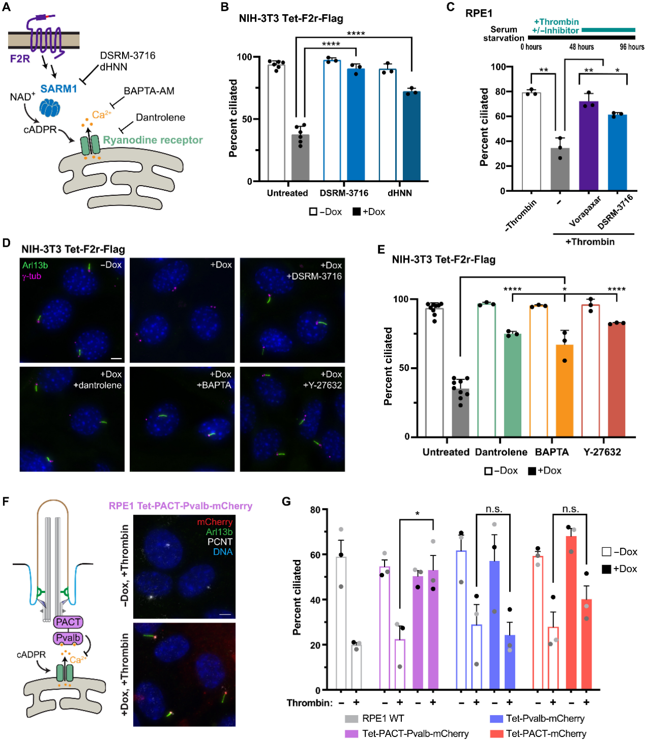 实验表明,SARM1是F2R启动后的下游分子。而且在使用丹曲林(RyR抑制剂)和钙螯合剂BAPTA-AM等抑制剂后,发现SARM1产生的cADPR激活RyR通道后会释放钙离子,随后通过RhoA 靶点激活的 ROCK 激酶触发纤毛解体