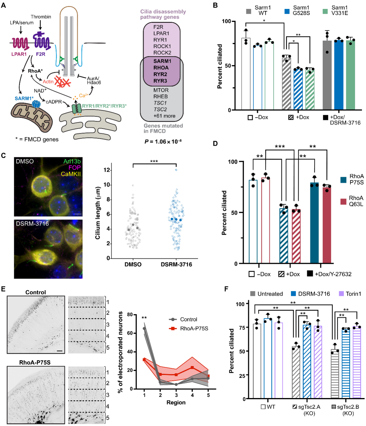 本研究通过CRISPRa筛选发现了F2R→SARM1→cADPR→RyR→钙离子→RhoA这一完整的纤毛解体信号通路。更重要的是,研究首次将纤毛解体通路异常与FCD的发病机制联系起来,提示在这条通路在FCD中的治疗潜能。