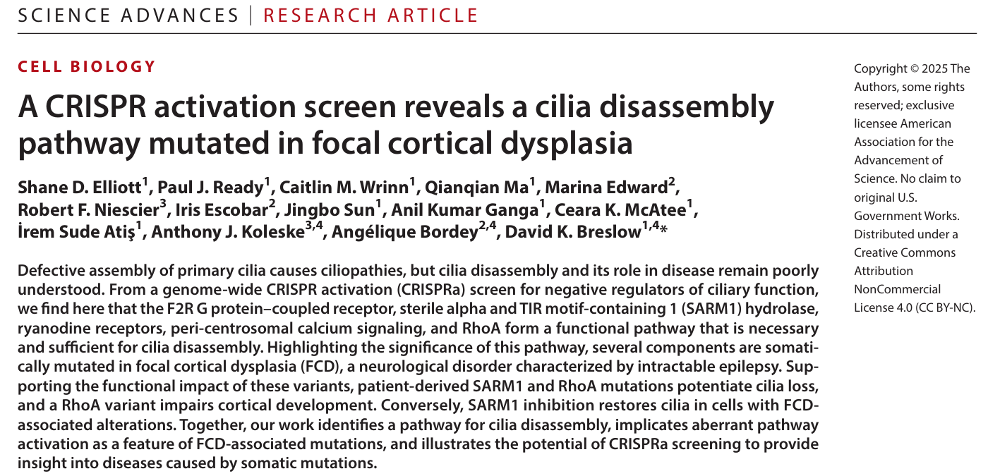 2025年10月29日,耶鲁大学David K. Breslow团队在《Science Advances》发表了题为"A CRISPR activation screen reveals a cilia disassembly pathway mutated in focal cortical dysplasia"的研究论文,该研究采用全基因组规模的