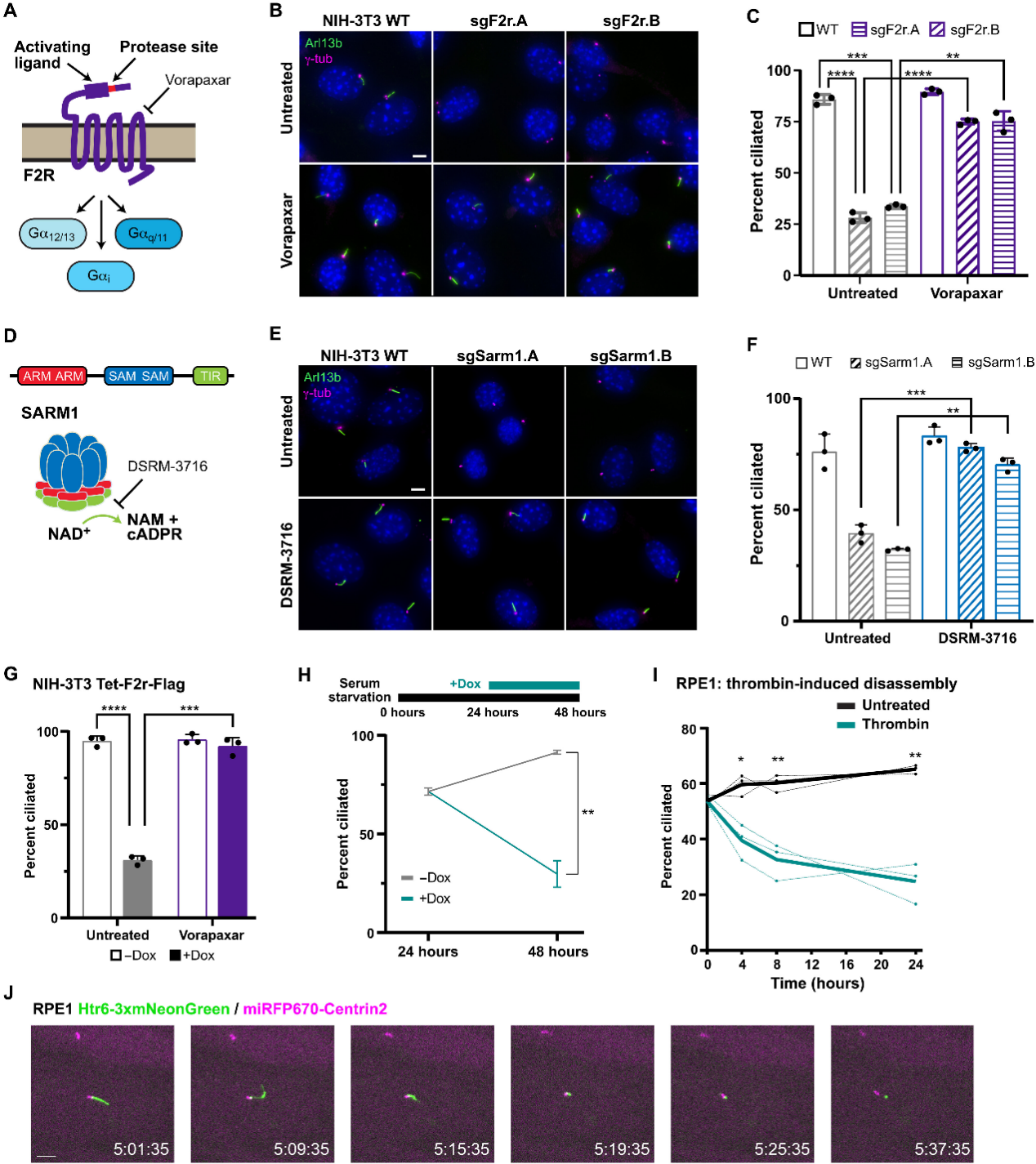 研究团队通过全基因组CRISPRa筛选(覆盖22,774个基因),鉴定出F2R和SARM1为纤毛解体的关键调控因子。通过功能性验证发现,过表达这两个基因均可使纤毛显著减少,而其特异性抑制剂(vorapaxar和DSRM-3716)可完全挽救纤毛丢失。