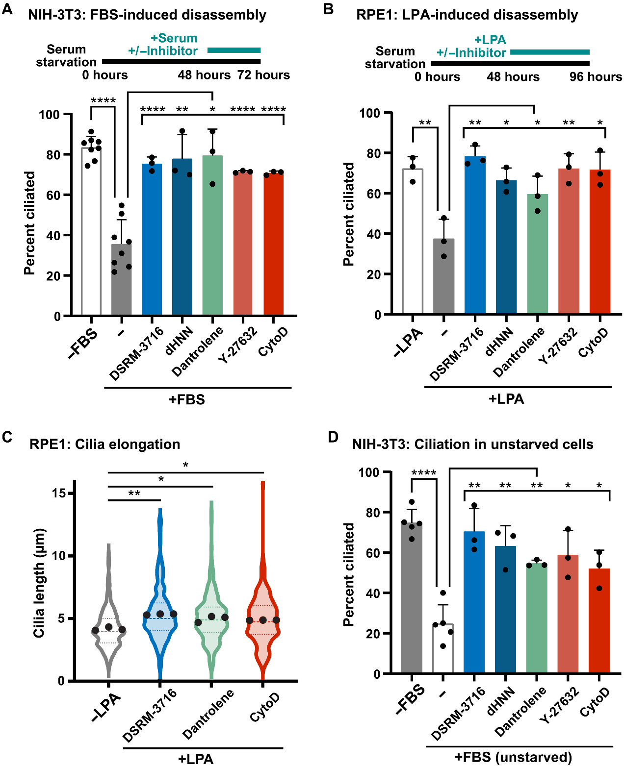 在血清或溶血磷脂酸(LPA)诱导的纤毛解体过程中,抑制SARM1、RyR或ROCK均显著维持纤毛稳定性,证明F2R–SARM1–RyR–RhoA/ROCK通路是血清促分裂原诱导纤毛解体的内源性关键通路。