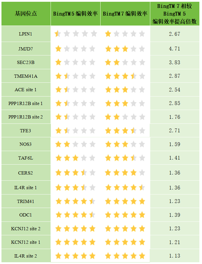 在容易编辑的位点(Bingo™ 5编辑效率大于20%)上,Bingo™ 7提供了全面提升,编辑效率最高可提升至86%。然而,Bingo™ 7的真正亮点在于其处理复杂、困难位点的能力。对于Bingo™ 5编辑效率低于20%的困难位点,Bingo™ 7的表现尤为出色——编辑效率提升了1.76倍至4.71倍!Bingo™ 7助您轻松解决曾经让人望而却步的编辑难题,为科研人员提供突破性机会。