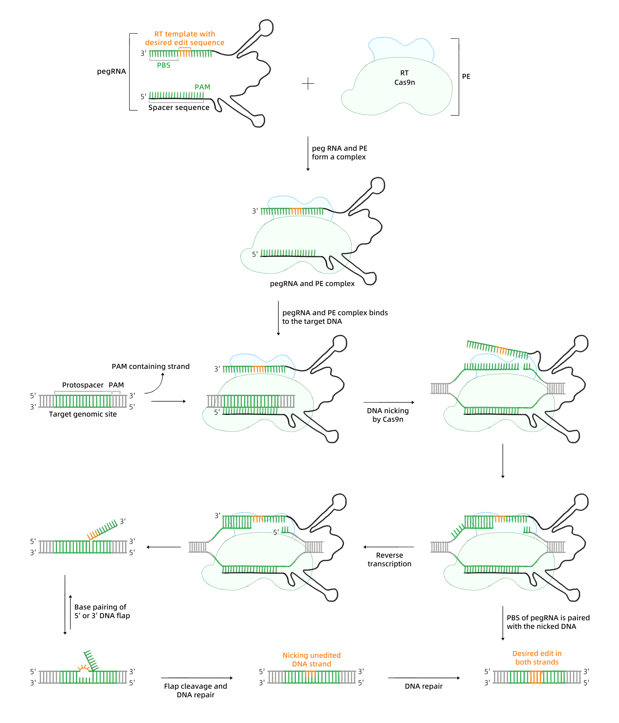 艾迪基因基于最新的Prime Editing编辑策略(PE7),建立了成熟的基因点突变编辑平台——Bingo™7。该平台具备先进的、成熟的方案设计系统与实验体系,可高效、精准地获得任意碱基转换、小片段的敲除或插入的细胞模型。解决您在实验过程中遇到的无法精准编辑、编辑效率低、转染效率低和获得纯合子效率低等问题,加速您的研究进度。