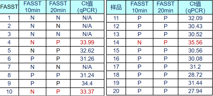 1.弓形虫检测:用FASST技术检测冰箱保存两年后的核酸样品,结果表明,20min即可获得和qPCR完全一致的结果;10min内检测结果表明,当Ct值≤33时,与qPCR检测结果的复合率为100%。