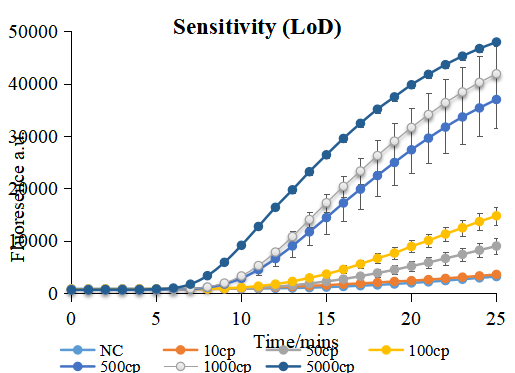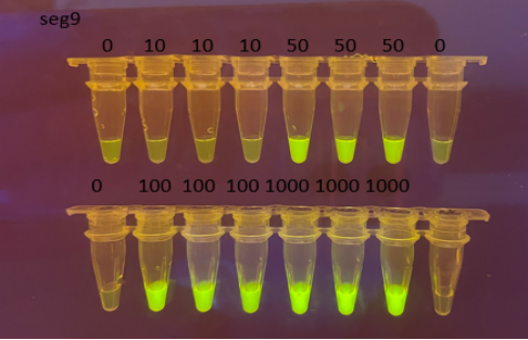 2.EHDV检测:使用EHDV seg9作为靶标,FASST技术可在5min内检测到1000拷贝;可在10min内检测到50-100拷贝的核酸。