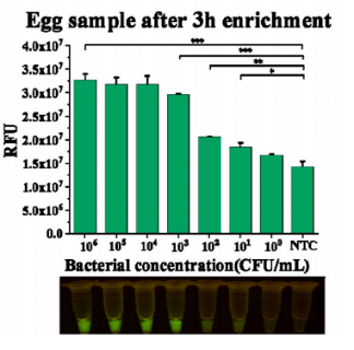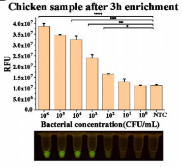 4.沙门氏菌快速检测:3h富集后,鸡肉样品中的检测限为10² CFU/mL,与QPCR灵敏度相当;鸡蛋样品中的检测限为10 CFU/mL,灵敏度优于QPCR。且通常快检需要9-12h富集时间。