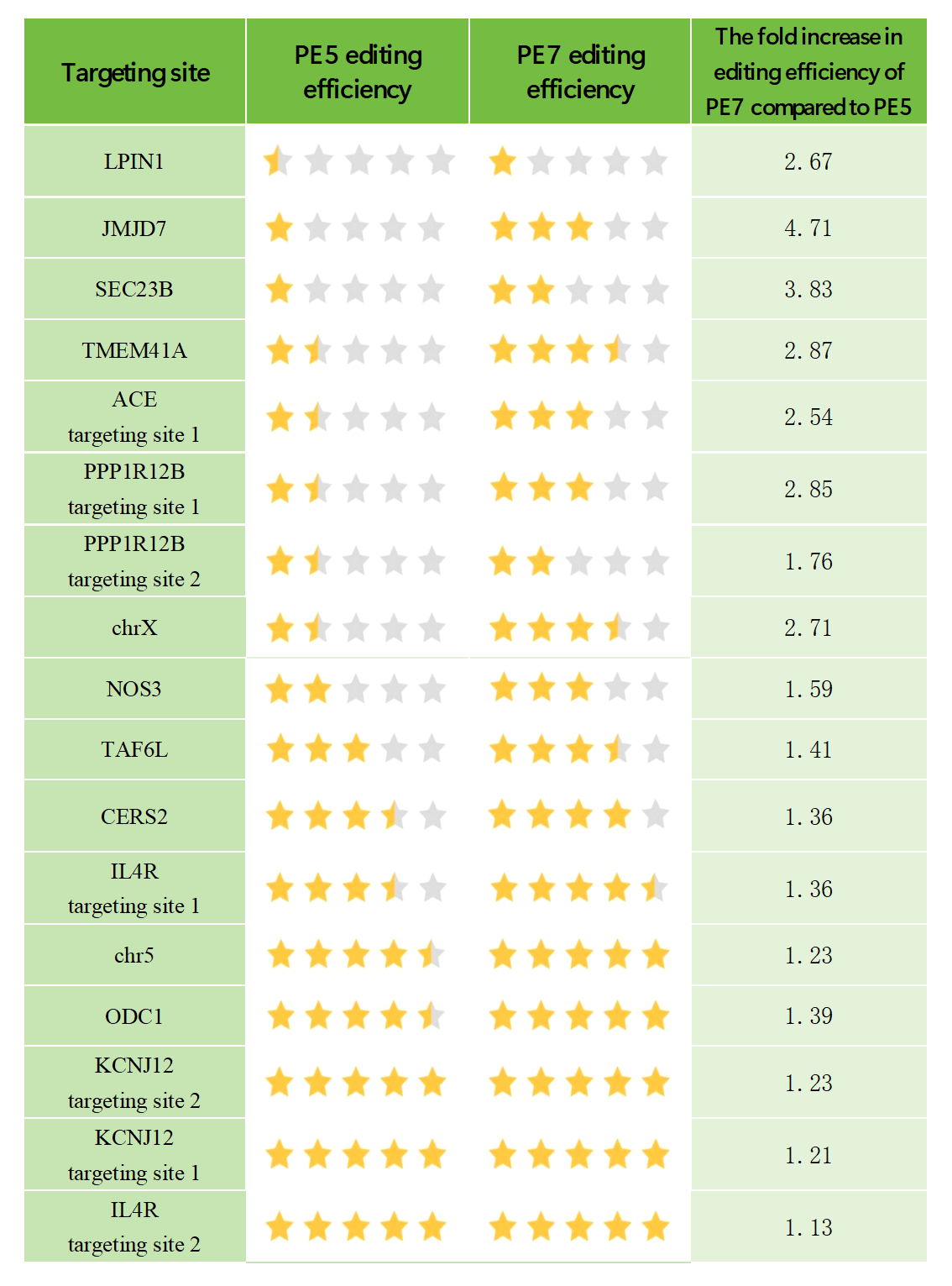 Improvement in editing efficiency of PE7 compared to PE5