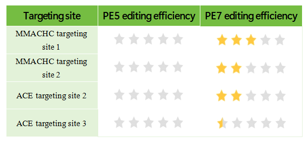 Bingo™ PE7高效的编辑效率,使那些挑战性的位点有了编辑的可能。我们对多个难以编辑的位点,分别使用PE7和PE5系统进行测试,结果显示Bingo™ PE7可以对这些位点实现有效的编辑。这意着以前难以编辑的任务变得可行,为突破性研究创造了可能。