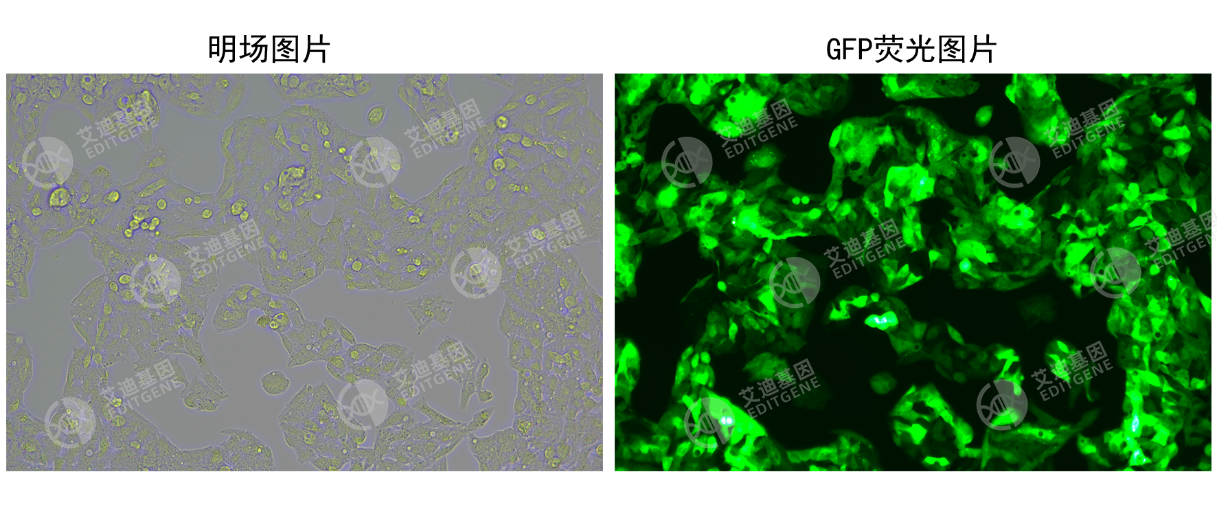 艾迪基因CopGFP稳转细胞株采用慢病毒转染构建,能够稳定高效地表达CopGFP荧光蛋白,可作为慢病毒感染实验中的对照细胞株使用。