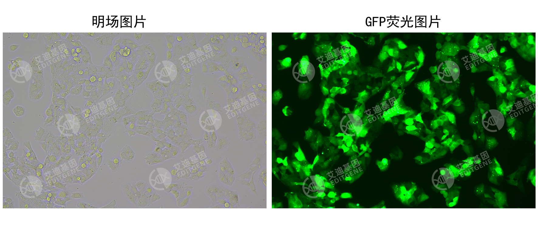 艾迪基因CopGFP稳转细胞株采用慢病毒转染构建,能够稳定高效地表达CopGFP荧光蛋白,可作为慢病毒感染实验中的对照细胞株使用。