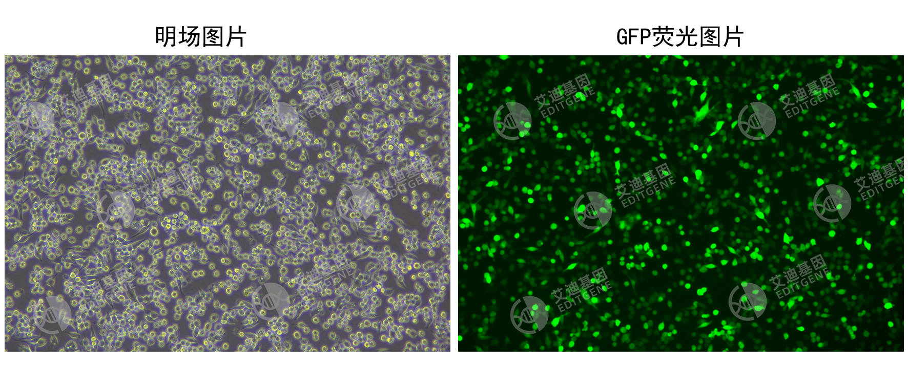 艾迪基因CopGFP稳转细胞株采用慢病毒转染构建,能够稳定高效地表达CopGFP荧光蛋白,可作为慢病毒感染实验中的对照细胞株使用。