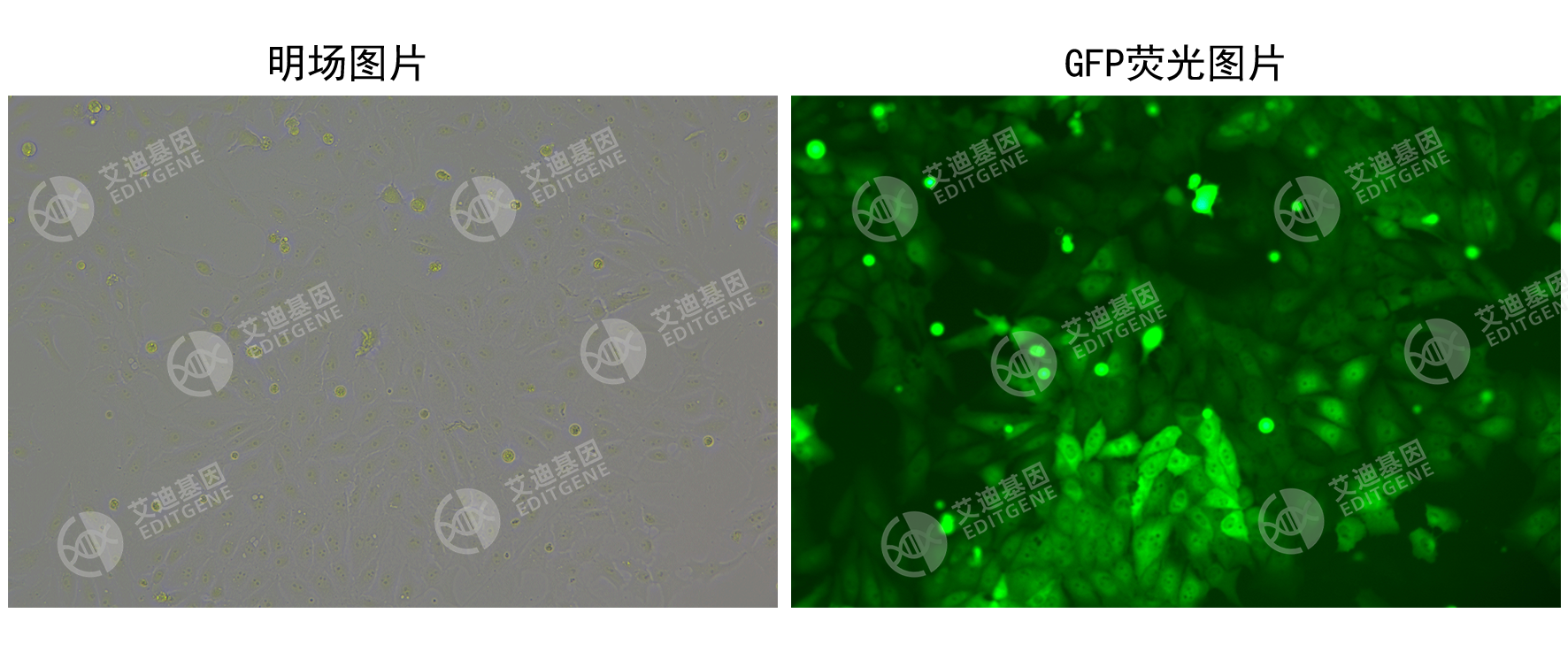 艾迪基因CopGFP稳转细胞株采用慢病毒转染构建,能够稳定高效地表达CopGFP荧光蛋白,可作为慢病毒感染实验中的对照细胞株使用。