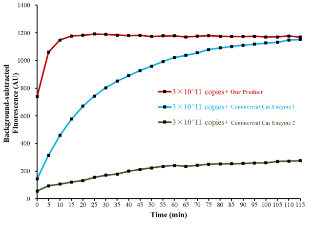 横坐标为反应时间,纵坐标为 Bio-rad CFX96荧光PCR仪检测结果。由图可见,相同的条件下,本产品在20分钟内可完全切割RNA报告探针,并达到荧光峰值,而其他同类产品荧光值明显较低,反应速度较慢,可见本品切割效率显著高于同类产品。