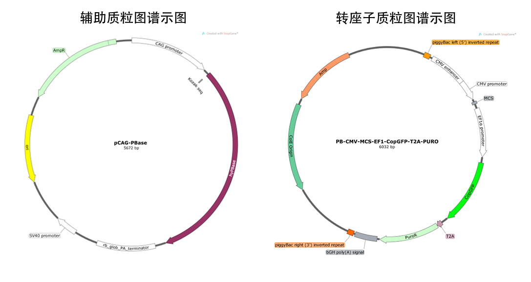 piggyBac转座子系统作为非病毒载体,与传统的病毒载体相比,PiggyBac具有以下优势:安全性高、操作方便(可直接用质粒转化细胞);载体容量大,可实现多基因的共表达;可通过调节转座子质粒和辅助质粒的比例,提高外源基因的整合效率,并且可通过反向PCR精确确定目的基因插入的位置;再次转座后实现转座子精确切离;宿主范围广,转座效率高,较少依赖宿主因子。