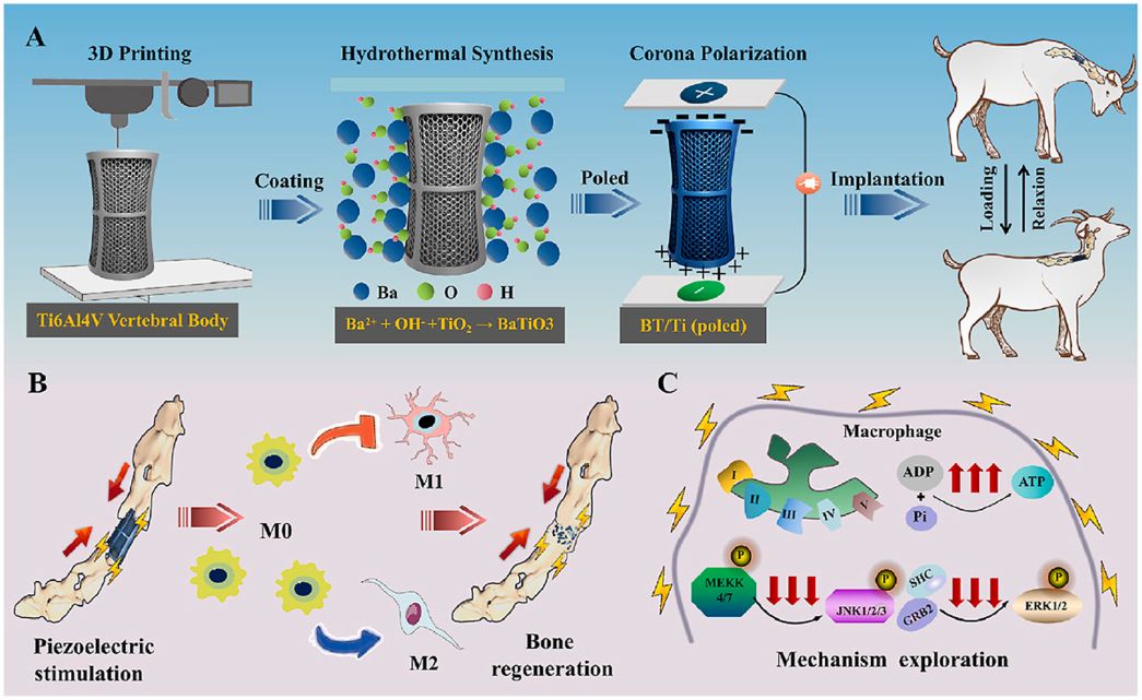 Electrical stimulation of piezoelectric BaTiO3 coated Ti6Al4V scaffolds promotes anti-inflammatory polarization of macrophage and bone repair via MAPK/JNK inhibition and OXPHOS activation