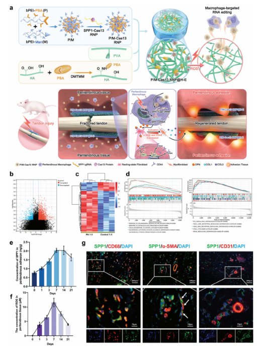 肌腱损伤急性炎症期中,巨噬细胞过度激活会导致编码骨桥蛋白OPN的SPP1过表达,影响组织再生。CRISPR-Cas13由于具有RNA编辑和快速降解的能力,在组织修复方面具有巨大潜力,但缺乏合适有效的递送方法。对此,研究人员系统筛选了针对巨噬细胞的阳离子聚合物,开发了一种能够高效递送Cas13核糖核蛋白复合物(Cas13 RNP)进入巨噬细胞的纳米簇载体。通过反应性氧种(ROS)响应性释放机制,该系统能够在肌腱损伤的急性炎症微环境中特异性抑制巨噬细胞中SPP1的过表达。实验结果表明,这种靶向策略显著减少了损伤诱导的SPP1产生巨噬细胞的出现,降低了成纤维细胞的激活,并减轻了肌腱周围的粘连形成。此外,该研究还揭示了SPP1通过CD44/AKT信号通路促进成纤维细胞活化和迁移的机制,并通过抑制这一通路有效缓解了肌腱损伤后的粘连问题。