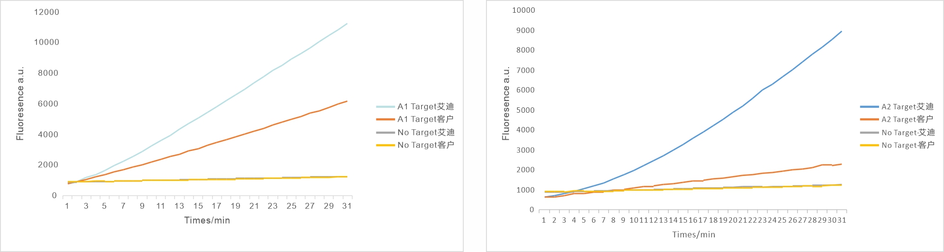 检测体系中添加待检Target模版、Cas12a、crRNA和荧光探针,当crRNA与Cas12a组装成功能复合物并识别Target模版后,会激活Cas12a的反式切割活性切割荧光探针释放出荧光信号。可以通过荧光值来反映crRNA的切割活性与灵敏度。左图和右图是分别针对A1 Target和A2 Target进行测试。结果显示,艾迪基因生产的crRNA的荧光强度更强,切割活性与灵敏性明显更优。